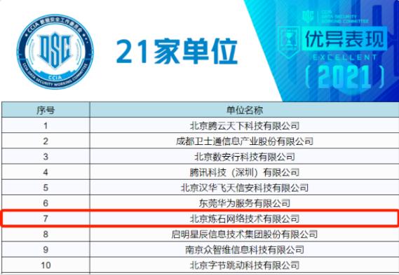 2022年3月17日,中国网络安全产业联盟数据安全工作委员会(以下简称数安委),发布关于表彰2021年度数据安全工作先进的决定。为了表彰在2021年度对数安委工作做出积极贡献的会员单位,根据各单位积分,经委员会提名、常务理事会审议批准,决定授予21家单位2021年度“表现优异奖”,北京炼石网络技术有限公司位列其中。